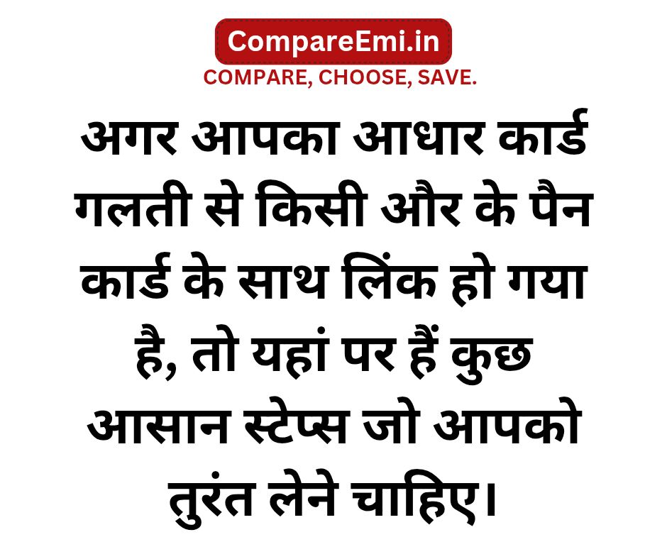 अगर आपका आधार कार्ड किसी और के पैन कार्ड के साथ लिंक हो गया है, तो ऊपर दिए गए स्टेप्स को फॉलो करें और तुरंत अपनी समस्या का समाधान निकालें। अगर आपको लोन से जुड़े किसी भी प्रकार की मदद चाहिए, तो CompareEMI.in पर विजिट करें और सबसे बेस्ट ऑप्शन पाएं!