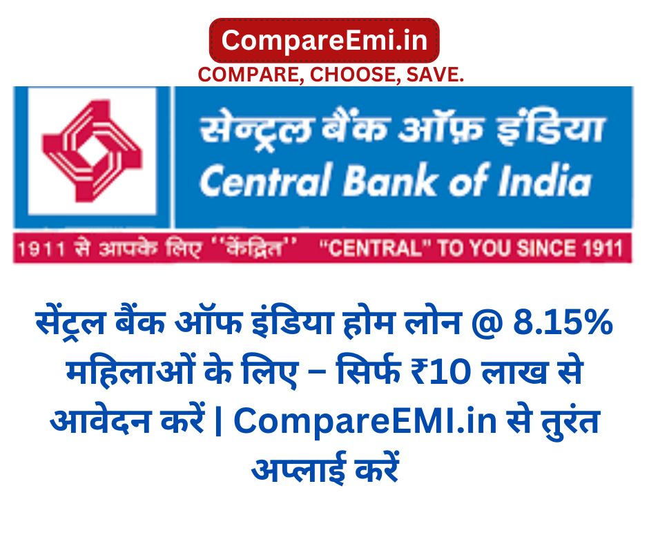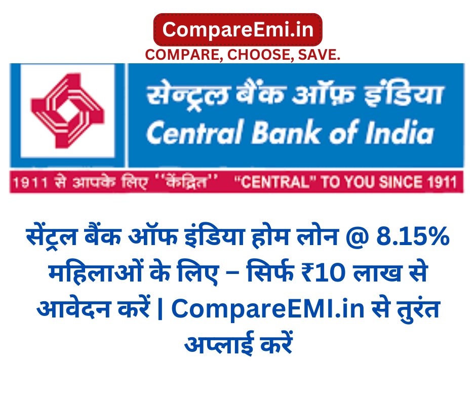महिलाओं के लिए सेंट्रल बैंक ऑफ इंडिया का होम लोन ऑफर 8.15% की ब्याज दर से एक सुनहरा मौका है। अगर आप भी इस ऑफर का लाभ उठाना चाहते हैं, तो अभी CompareEMI.in पर जाएं और तुरंत आवेदन करें।