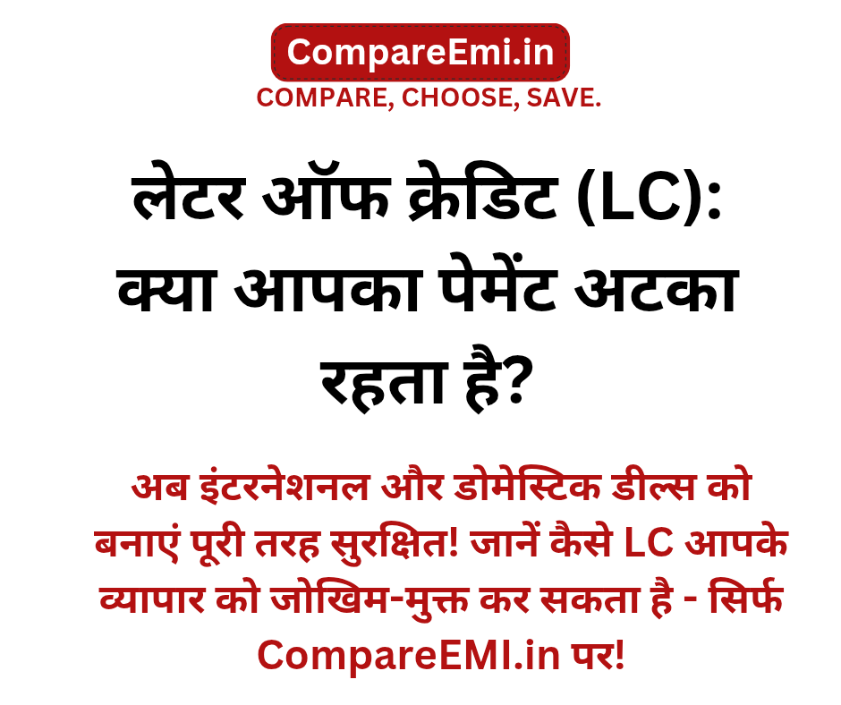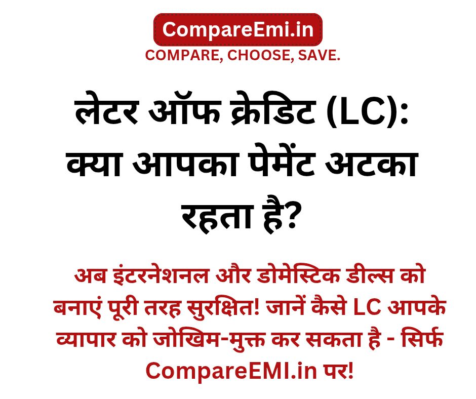 यदि आप इम्पोर्ट या डोमेस्टिक ट्रांजेक्शन्स के लिए लेटर ऑफ क्रेडिट (LC) का उपयोग करना चाहते हैं और फाइनेंसिंग के अन्य विकल्प ढूंढ रहे हैं, तो CompareEMI.in आपकी सहायता कर सकता है।