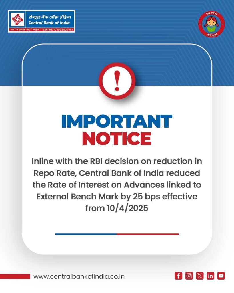 भारतीय रिज़र्व बैंक (RBI) ने हाल ही में रेपो रेट (Repo Rate) में कमी की है। इसके चलते सेंट्रल बैंक ऑफ इंडिया जैसे बैंकों को भी अपने लोन उत्पादों पर ब्याज घटाने पड़े। बैंक की ऑफिशियल वेबसाइट पर जारी नोटिस के मुताबिक, 10 अप्रैल 2025 से यह नई ब्याज दर लागू हो चुकी है।